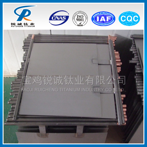宝 鸡锐诚钛业公司研发的电解、电镀用钛阳极,不溶性阳极是在钛基体(网状、板状、带状、管状等)上涂覆具有高电化学催化性能的贵金属氧化物涂层。新型不溶性 钛阳极具有高电化学催化能,析氧过电位比铅合金不溶性阳极低约0.5 V,节能显著,稳定性高,不污染镀液,重量轻,易于更换。 新型不溶性钛阳极的 析氧过电位也比镀铂不溶性阳极低,但是寿命却提高1倍以上。广泛用于各种电镀中作为阳极或者辅助阳极使用,可以替代常规的铅基合金阳极,在相同的条件下, 可以降低槽电压,节约电能消耗;不溶性钛阳极在电镀过程中具有良好的稳定性(化学、电化学),使用寿命长。此阳极广泛用于镀镍镀金、镀铬、镀锌、镀铜等电 镀有色金属行业。